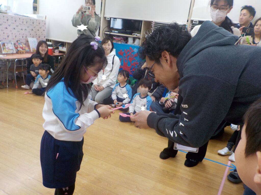 年中・年少・りす組さんから年長組さんにメダルのプレゼントをしました。