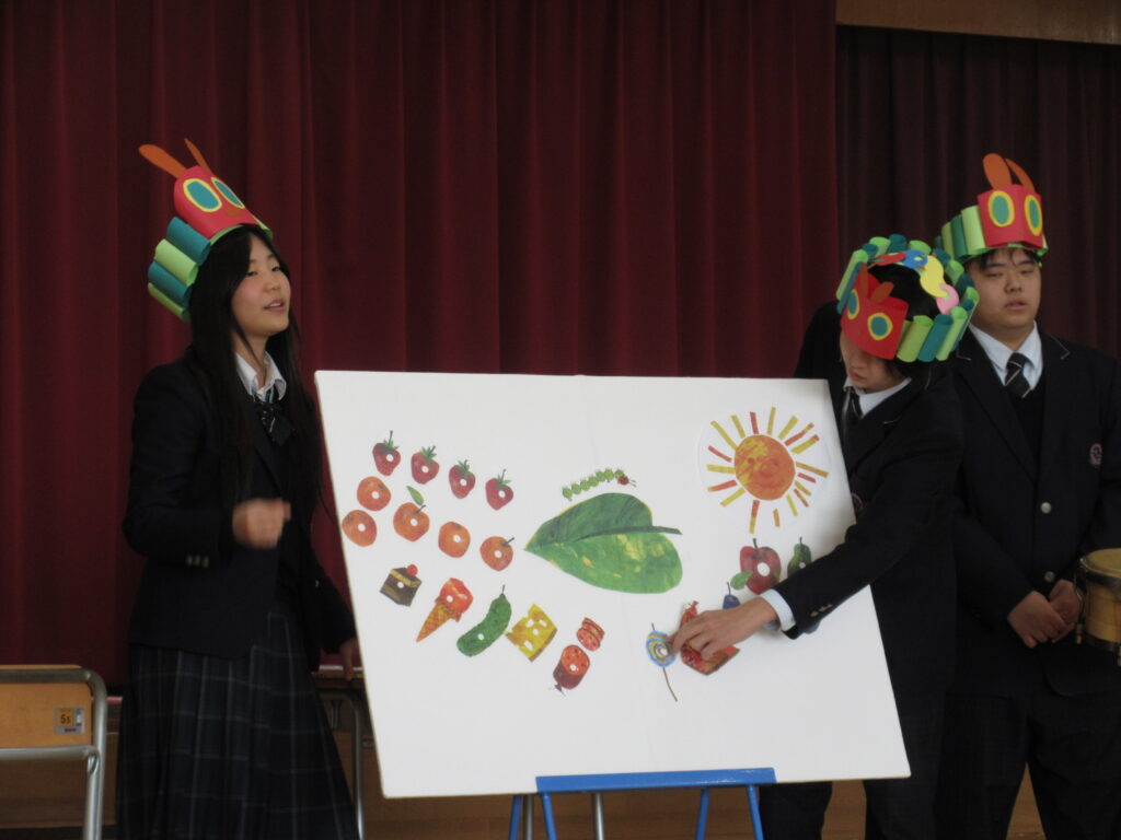 箕面学園高等学校のお兄さんお姉さんが、ホームクラスのお友だちに、「はらぺこあおむし」のお話のパネルシアターをみせてくれました。