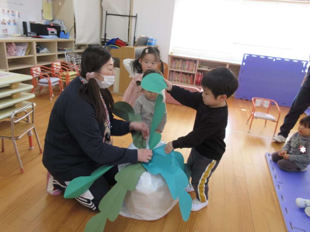 年長組さんのペープサート劇を観に行きました。