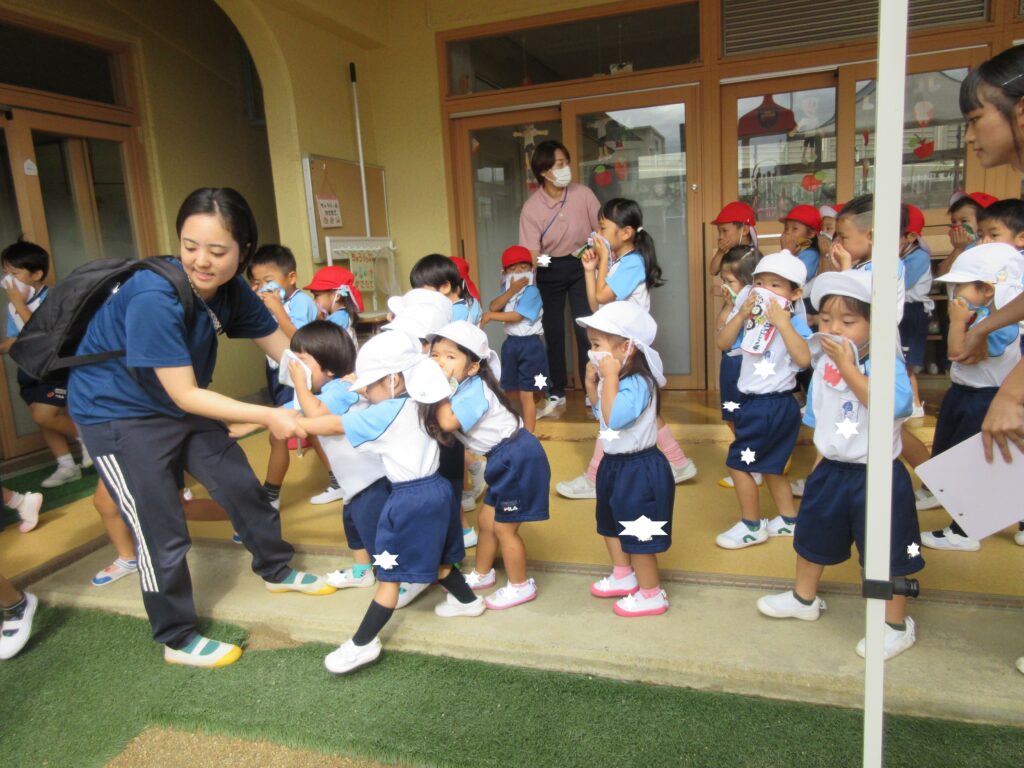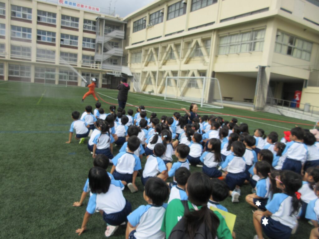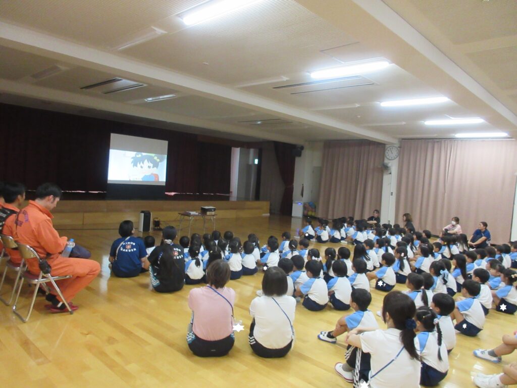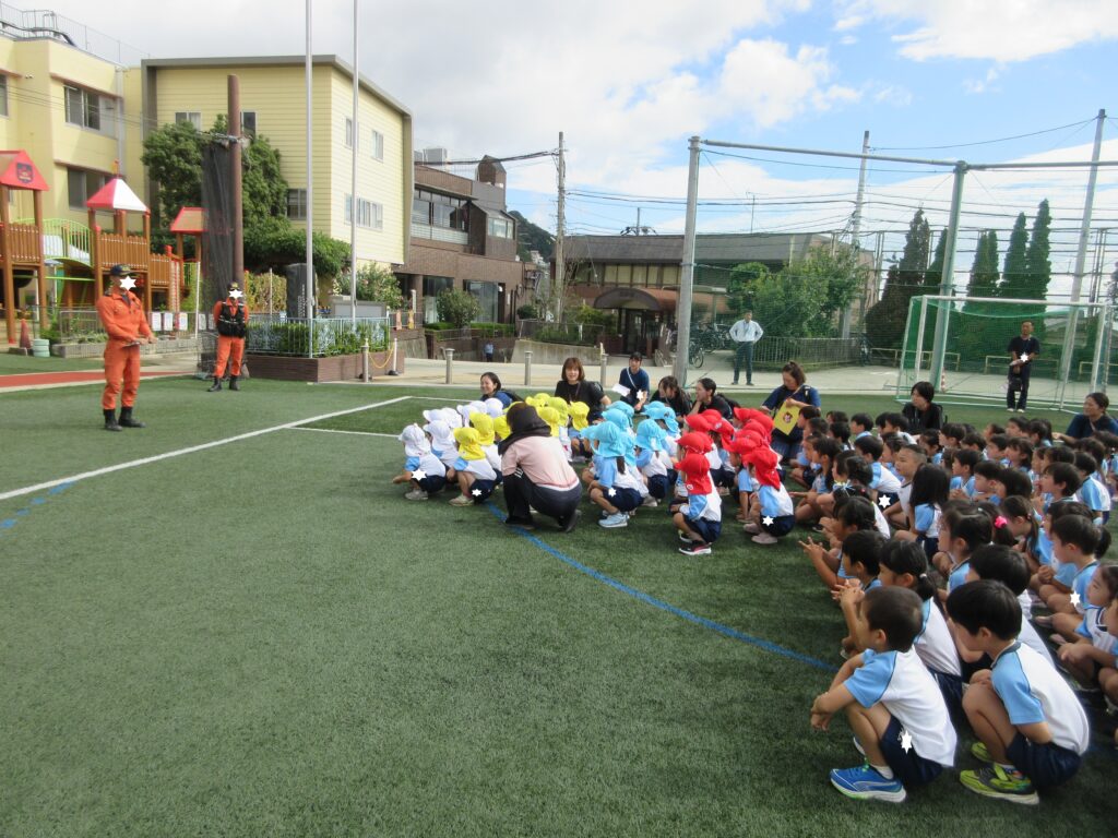 今回は消防士さんたちが幼稚園に来て下さり、火災の危険や避難の仕方について教えていただきました。