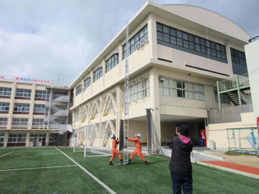 火事を想定した訓練では煙を吸わないよう、口をおさえながら速やかに避難しました。