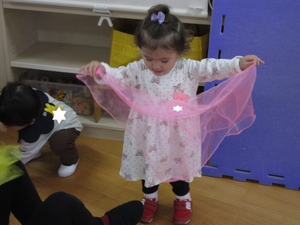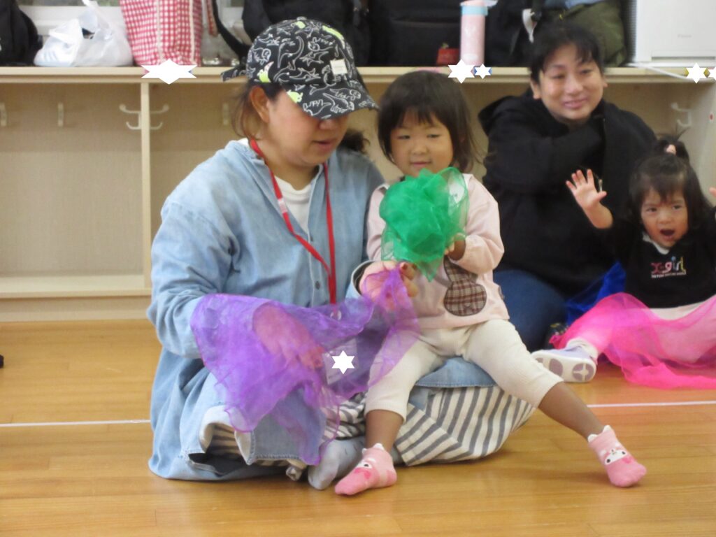 今日はリトミックスカーフを使っていろいろな遊びを楽しみました。ふわふわでカラフルなスカーフに興味津々の子どもたちでした。