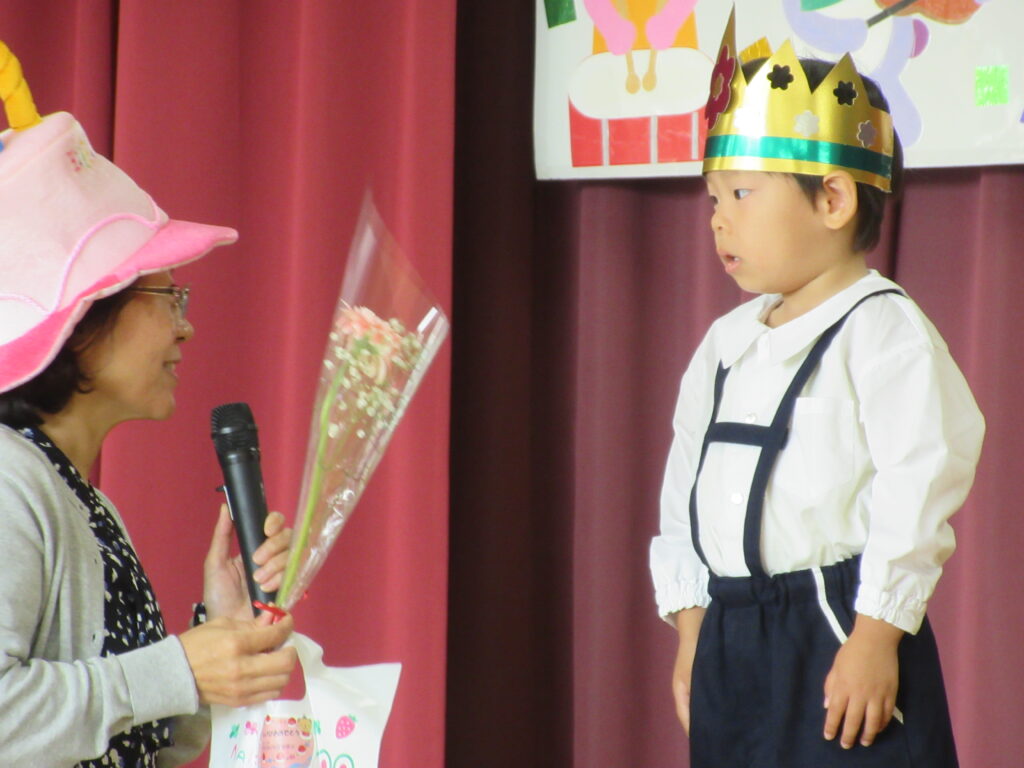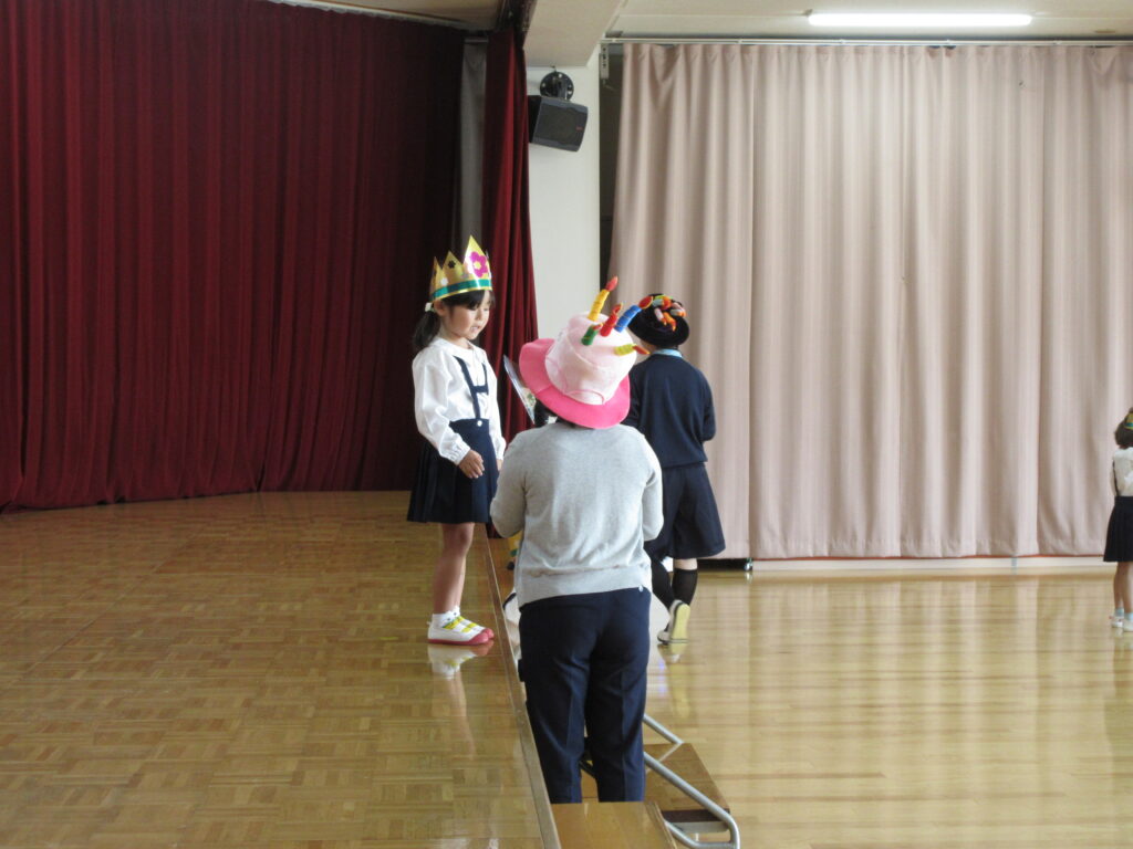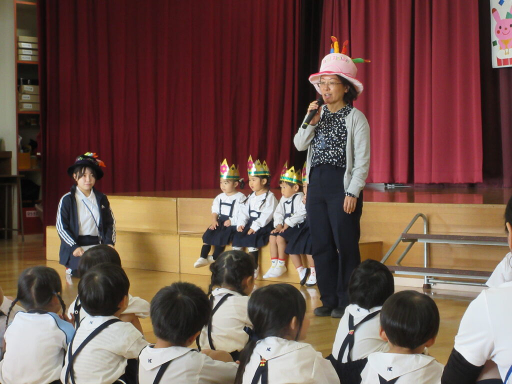 10月生まれのお友だちのお誕生会をしました。今月は、年長組さんがインフルエンザで学年閉鎖になったので、年中・年少・りす組さんのみお祝いしました。