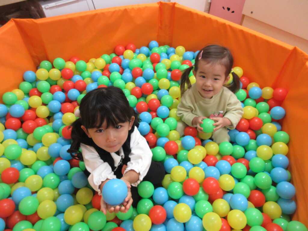 先生に絵本も読んでもらいました。そのあとは、広いお部屋に移動して、ボールを使った遊びをたくさん楽しみました。