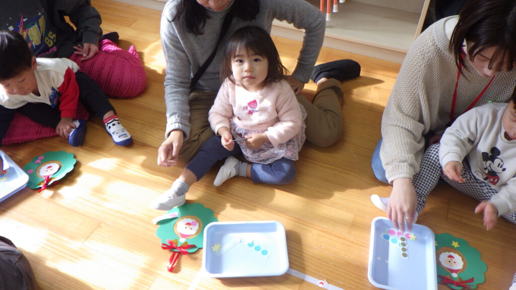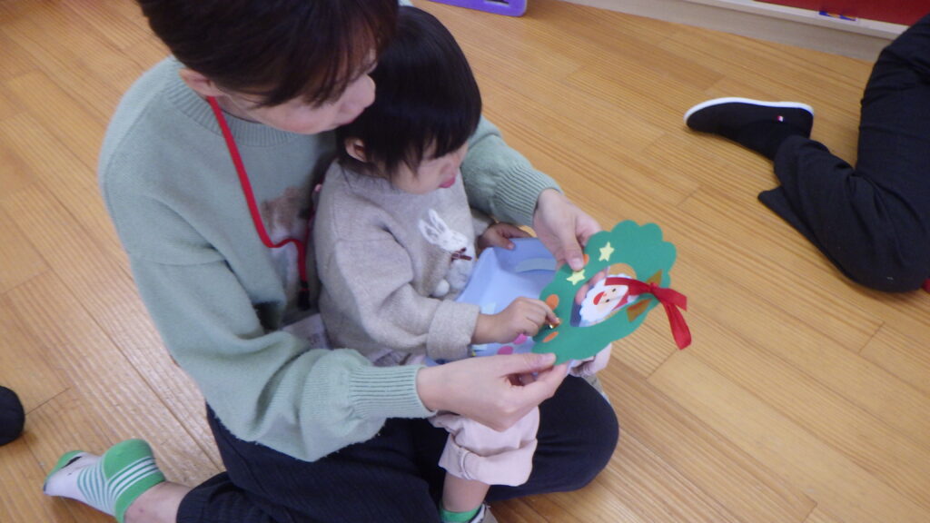 今回のかるがもでーでは、クリスマスのリースを作って楽しみました。