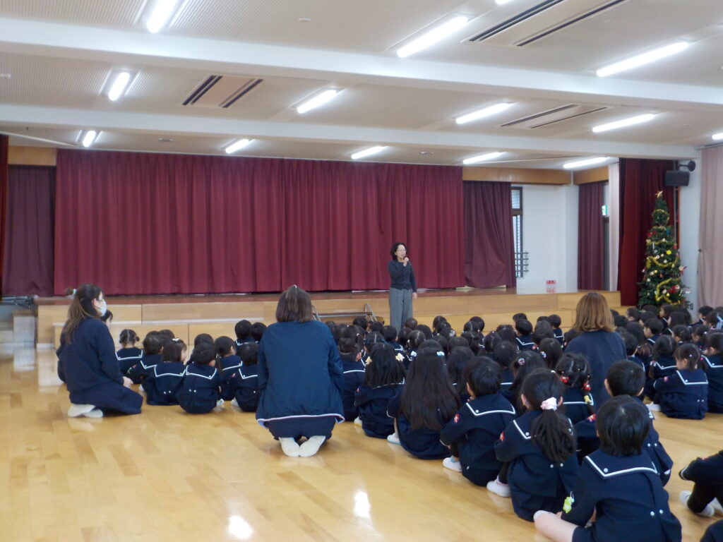 2学期も今日で終わり、終業式に参加しました。園長先生、副園長先生のお話を聞き、2学期を振り返り、みんなの成長を一緒に喜んだり、冬休みの過ごし方など確認したりしました。次にみんなが揃うのは、来年1月8日です。それまで、元気に楽しく過ごしてくださいね!