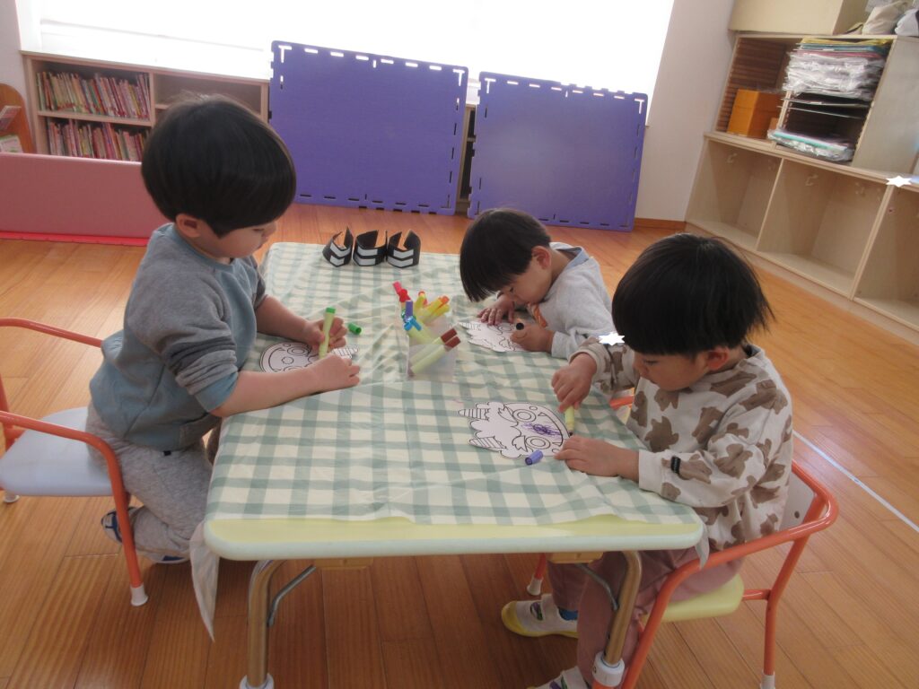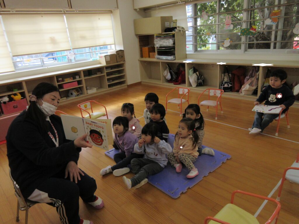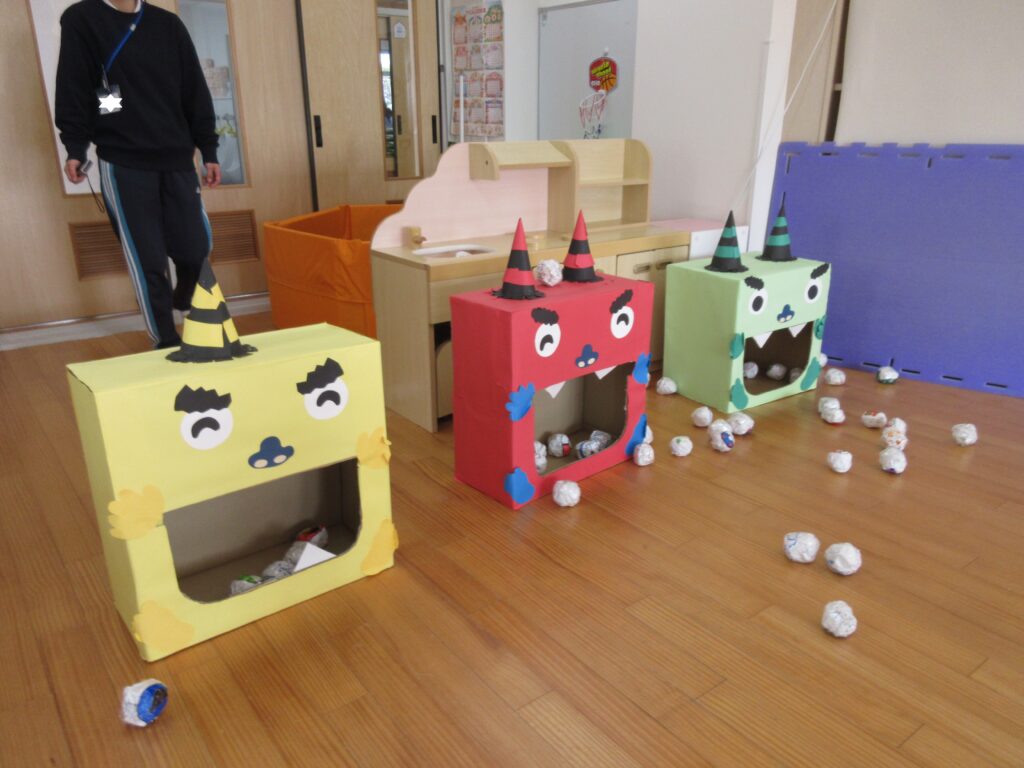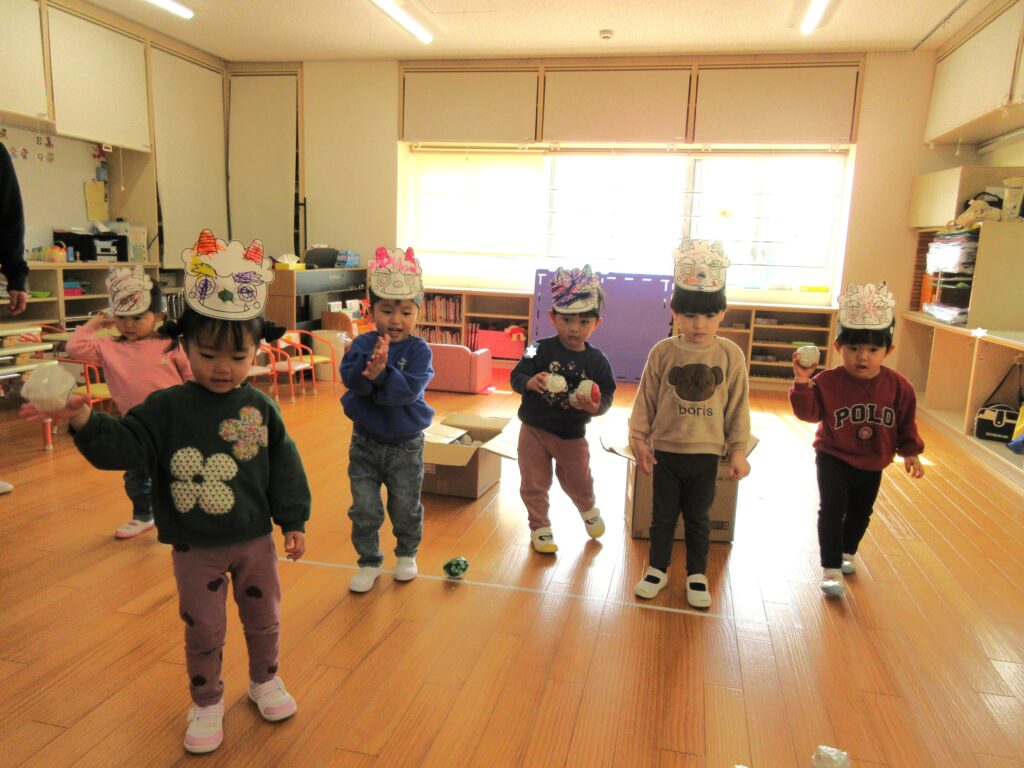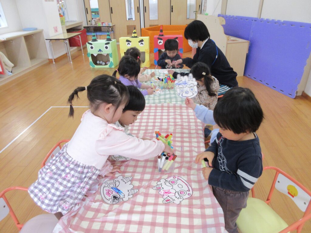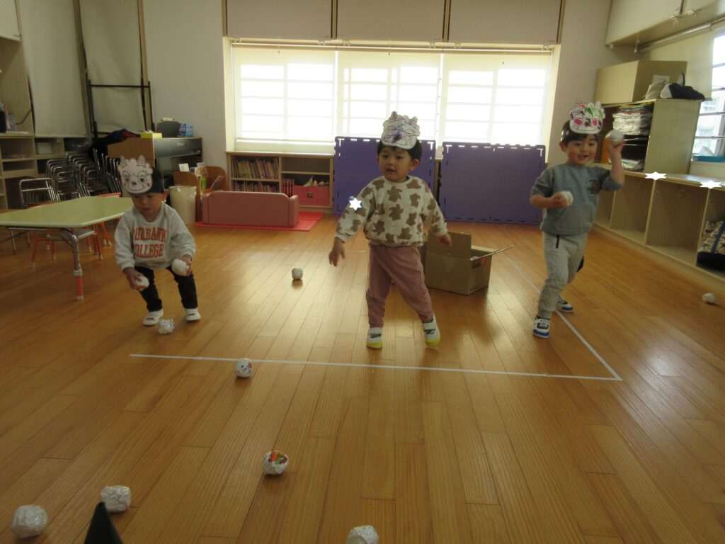 今週のプレ幼稚園では、節分が近いので、鬼のお面を作って、豆まきを楽しみました。