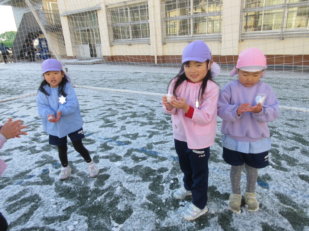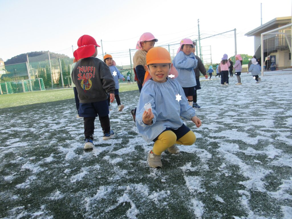 今朝は、グラウンドに雪が積もっていました。さっそく雪遊びにでてきたこどもたちです。